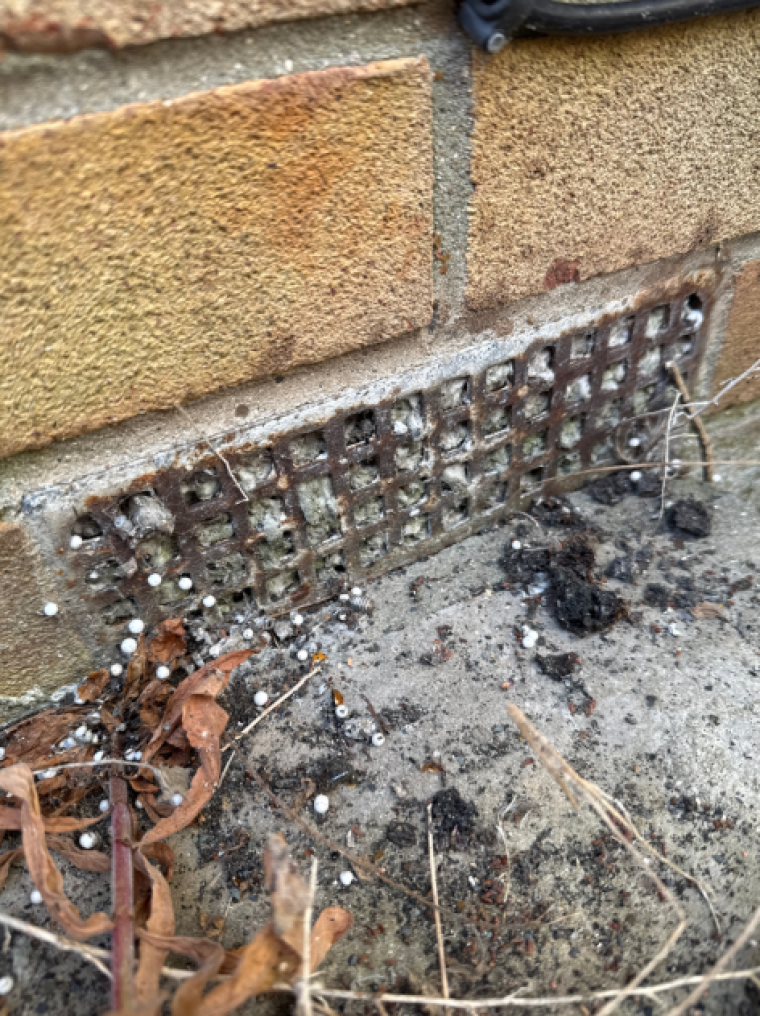 In this case, the insulation was installed too low, and the beads have begun spilling out of the air bricks. A serious red flag. Air bricks play a vital role in ventilating suspended timber floors, preventing the buildup of moisture under the property. When blocked, airflow is restricted, leading to damp and rot risks.